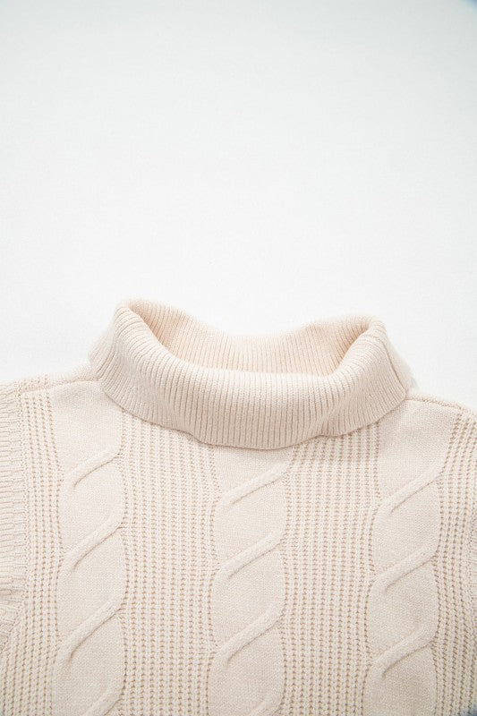 Cable Knit Turtleneck Ruffle Short Sleeve Sweater